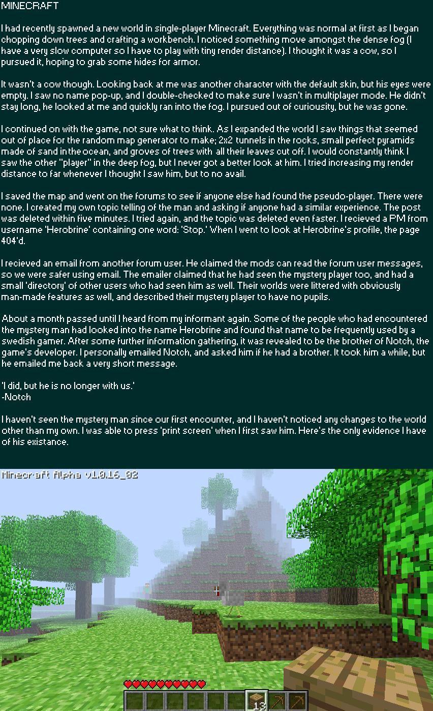 This page is my attempt to catalogue the development of the Herobrine legend alongside the game itself and other Minecraft-related mysteries/weirdness, in the form of a linear timeline of events. A lot of it may seem tangential or unrelated, but this context is interesting to me.